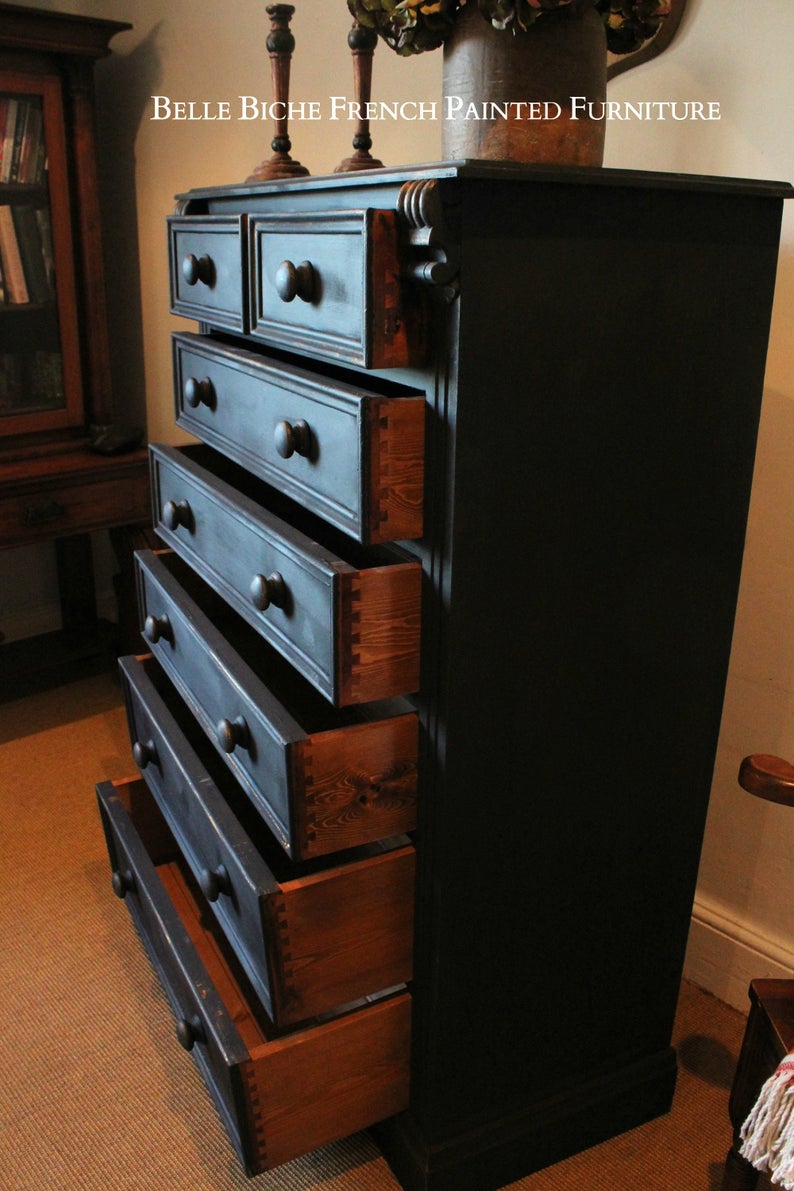 Artisan hand painted and aged, in our sultry, BB 'Parisian Black' - this substantial tallboy piece would add an immediate touch of decadent elegance to 'any' room where 'stylish' storage was required.